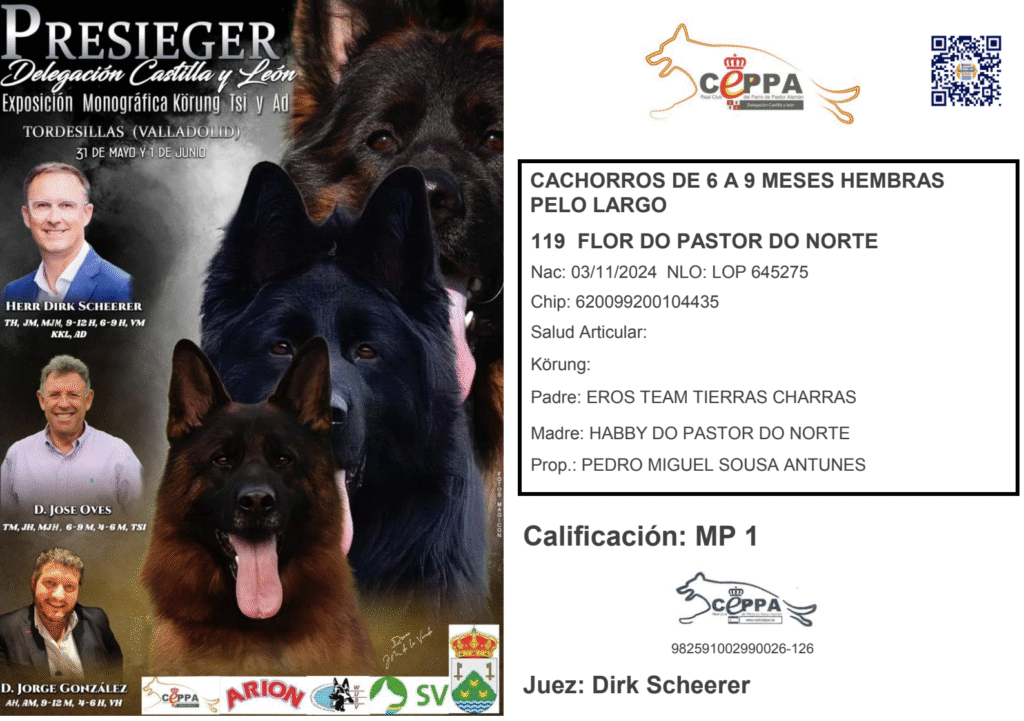 - 🥇Franco do Pastor do Norte obteve 1º lugar no segundo dia, na classe de Bebés Macho de Pêlo Comprido.